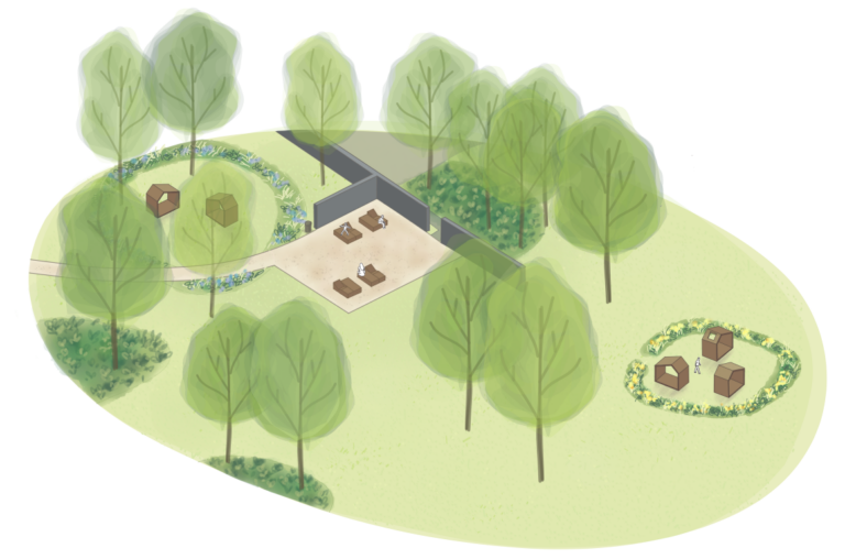 Waldsaumerweiterung mit Sträuchern und extensiver Wiese: Diese Maßnahme trägt zur Förderung der Artenvielfalt bei und schafft einen naturnahen Übergang zwischen Park und Wald.