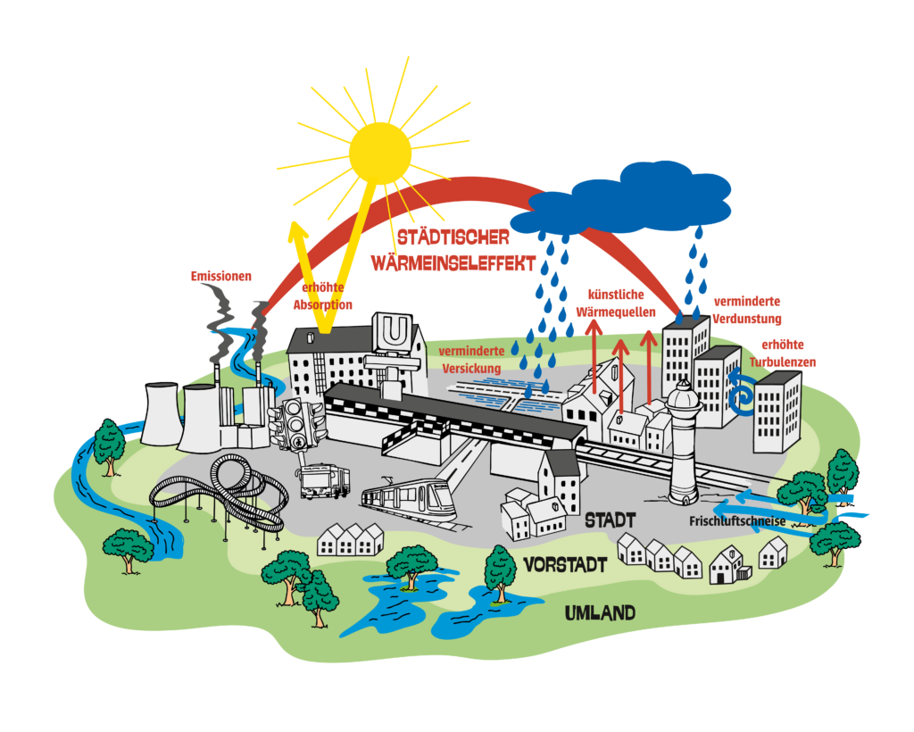 Die vielen Gebäude und Straßen speichern die Sonnenwärme. Das führt dazu, dass es auch nachts warm bleibt und die Temperaturen nur langsam sinken. Außerdem gibt es in der Stadt weniger Kaltluft, weil hohe Gebäude und enge Straßen den Luftzug einschränken. Auch die Wärme von Automotoren und Fabriken  und tragen dazu bei, dass es in der Stadt nachts wärmer bleibt. Wenn wir wegen der warmen Nächte nicht gut schlafen, fällt es uns am nächsten Tag schwerer, uns zu konzentrieren.