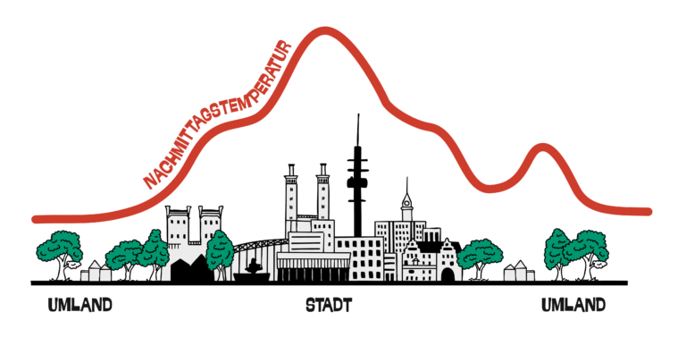 In jeder Stadt gibt es sogenannte Hitzeinseln. Hitzeinseln sind Orte, an denen es im Sommer besonders heiß wird. Hitzeinseln befinden sich vor allem da, wo viele Gebäude stehen und es viele Straßen und Parkplätze gibt, zum Beispiel in der Innenstadt oder Stadtteilzentren. Der Beton sorgt dafür, dass die Wärme von der Sonne gespeichert wird und es auch nachts kaum kühler wird.