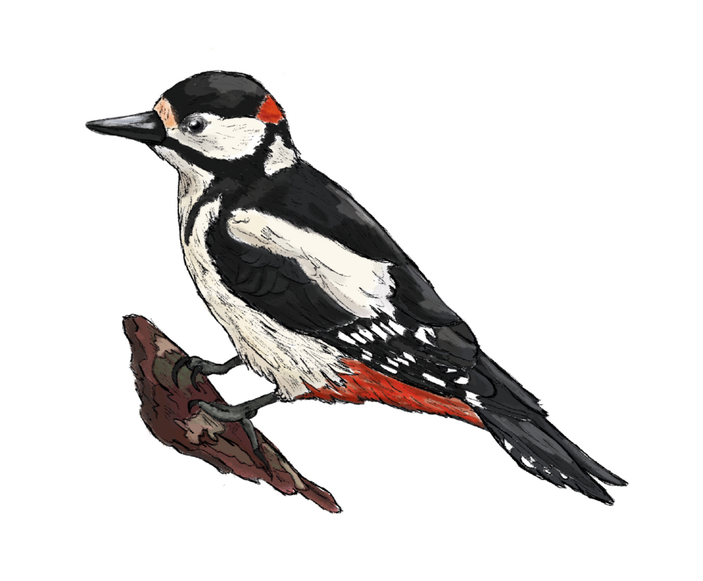 Der Buntspecht lebt in Wäldern und ist bekannt für sein Trommeln auf Bäume. Er sucht Insekten unter der Baumrinde. Sein Gefieder ist schwarz-weiß mit roten Federn unter dem Schwanz.