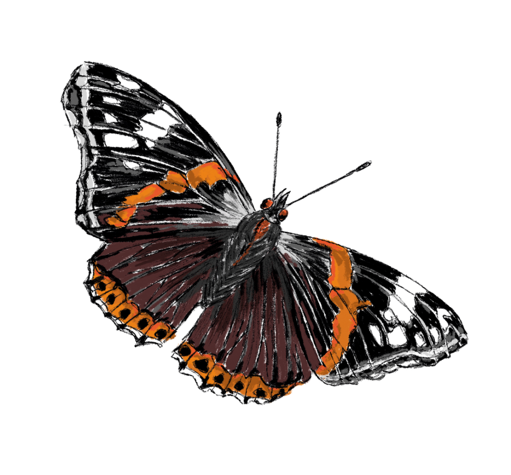 Der Admiral ist ein Schmetterling mit auffälligen orangefarbenen Flügeln mit schwarzen Flecken. Er fliegt oft weite Strecken im Sommer und Herbst. Die Raupen des Admirals fressen Brennnesseln.