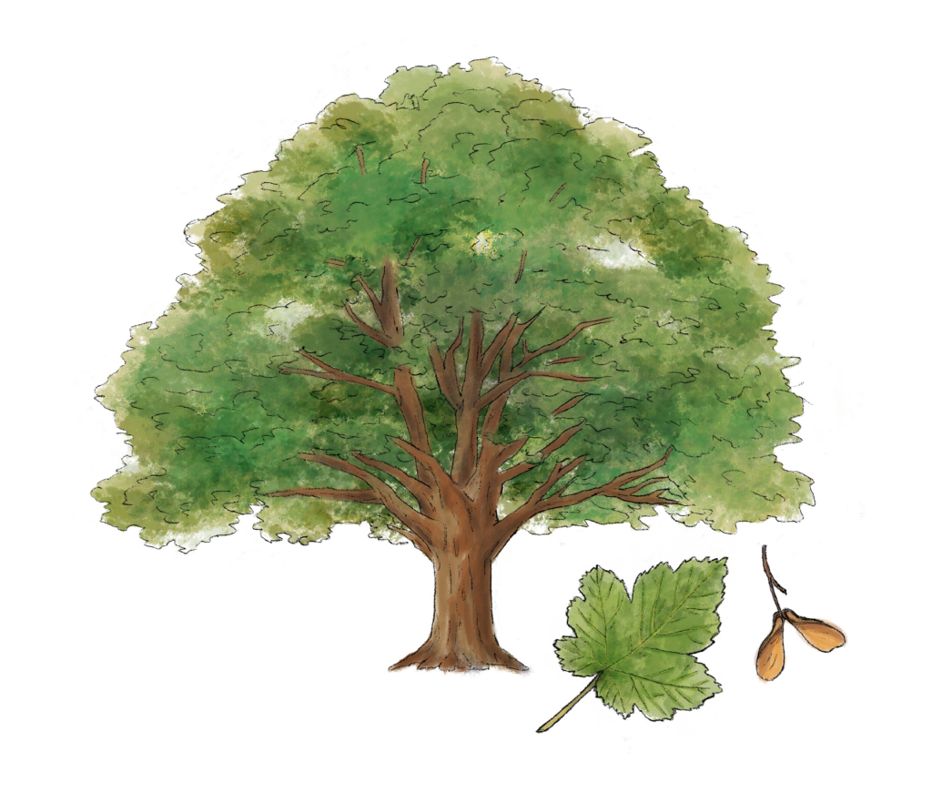 Der Bergahorn ist ein großer Baum, der im Gebirge wächst. Seine Samen haben kleine Flügel, die durch den Wind verbreitet werden.
